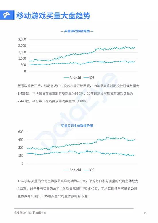 从整体趋势来看,2018年日均买量公司为413家,2019年增至462家。产品数量方面,最高峰时期投放游戏数量为2443款,日均在线投放数量为1440款,同比去年增长50%。