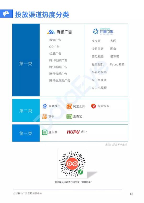渠道方面,《2019移动游戏全年买量白皮书》将投放渠道热度分为三个类别。