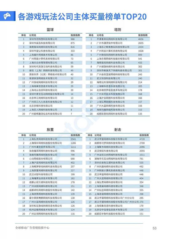 各游戏玩法公司主体买量榜单TOP20中,头部与尾部之间的差距更加明显。