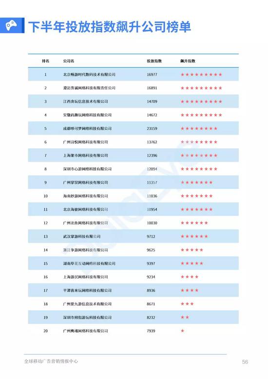 整体来看,北京畅游时代在2019年下半年投放飙升最快,投放指数16977,飙升指数9颗星,不过与第2名的澄迈贵城差距不足100;贪玩排名第3,投放指数14709,飙升指数同样9颗星。哆可梦虽然投放指数破20000,但飙升指数略差一筹,仅8颗星,排名第5。