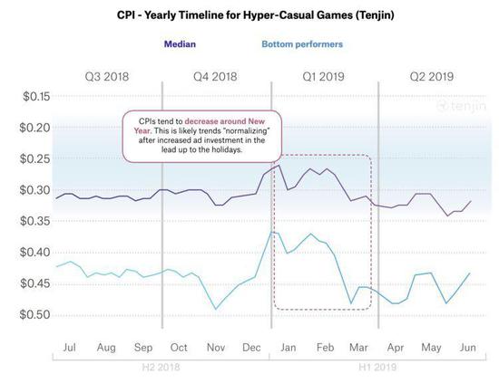 这意味着CPI受到的影响很大,Tenjin在他们的GameAnalytics报告中以从2019年Q1以来缓慢增长的超休闲游戏CPI趋势为我们提供了一个预览。