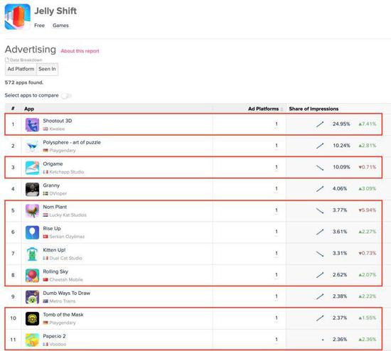 超休闲游戏之间的用户流动,可以通过《Jelly Shift》的广告展示占比图来观察,在发布广告的前11个应用中,有8个都与其互有用户流动