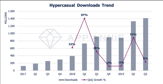 在2019年Q2和Q3,超休闲游戏下载量同比增长为5亿-6亿,(55%-85%),尽管数字具有绝对说服力,但这是否是必然的增长趋势?根据最新的数据,可以看出,2019年Q3的环比增长率已经回到2018年Q4的水平。这清楚地说明,增长率并不能与季度营收率同步,并且它更多地是显示峰值而不是趋势。