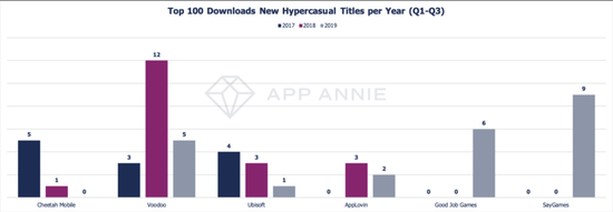 多年来,在下载榜TOP100中,Voodoo旗下产品的数量大幅下降,而类似Good Job Games和Say Games这样的新锐正在占领市场
