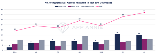 在TOP100下载榜上,尤其是排名25之前的超休闲游戏数量从未如此之高,这是导致2019年Q2超休闲游戏下载激增的主要驱动力