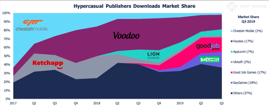 SayGames和Good Job Games共同占据35%的市场份额,其实是Voodoo,达到17%。Voodoo对超休闲游戏市场的短暂统治是一个证明,某种意义上来讲,纯粹专注于超休闲游戏的发行商很难长期保持竞争优势。