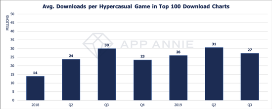 超休闲游戏下载TOP100榜单中的每款游戏,其平均下载量自2018年以来一直保持相对稳定因此,如果某个季度的热门下载排行榜中的超休闲游戏数量非常多,那么市场规模波动就会出现。这就是2019年Q2发生的事。