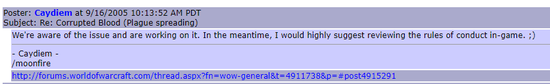 就这样,游戏中的瘟疫继续存在了一段时间。暴雪最终在10月份发布一个补丁,修复了“堕落之血”可以在NPC和宠物间传染的错误,算是给事件彻底画下了句点。