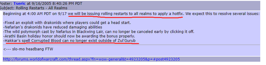 而唯恐天下不乱的玩家开始扩散瘟疫:目睹能将Debuff带出本传播的奇特玩法,大量“模仿犯”产生了。这些通过网络和论坛得知BUG机制的玩家,用自己的角色从副本里人肉带出瘟疫,在各大主城传播。