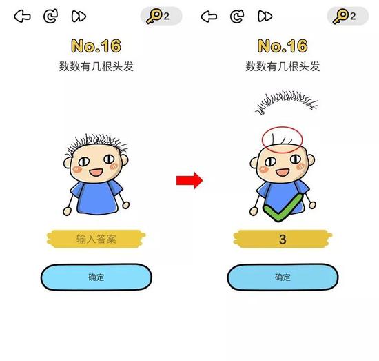 游戏问题设置偏恶搞,需要另辟蹊径才能通关,答案出人意料又有趣,这种稍微费脑又耍小聪明的风格让各国玩家逐渐上头。像上面这一关,一般玩家都不会想到画面中的人物戴了顶假发,需要把假发移开才看得到真正的头发数量。