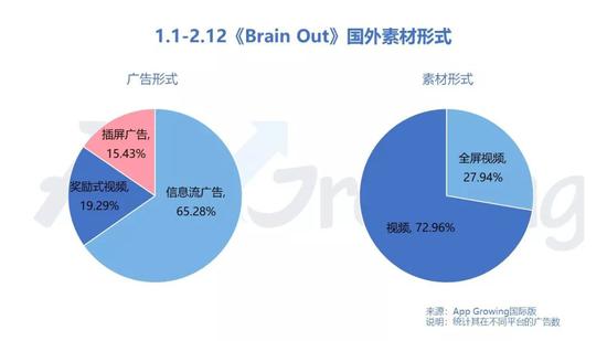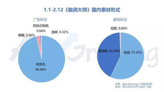 在国内,《脑洞大师》的广告形式几乎都为信息流广告,占比高达96.48%。广告素材基本都是视频形式,竖视频素材占比高达42.29%。