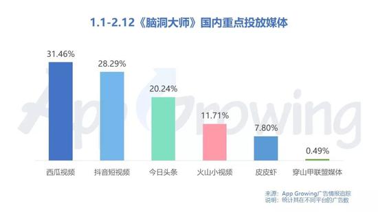 而国内版《脑洞大师》主投西瓜视频、抖音、头条、火山小视频及皮皮虾等头条系广告媒体。春节宅在家中靠刷短视频消磨时间的用户想必会时不时刷到该手游的相关视频。