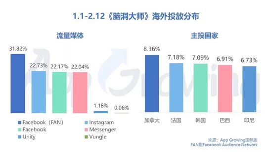 作为一款超休闲游戏,《脑洞大师》走的是靠广告变现。游戏中会在右上角提供少量提示钥匙,在玩家绞尽脑汁时提供解谜思路,当然获取钥匙的方式便是通过观看广告。这种不用氪金的属性也放低了用户门槛,有助于刺激玩家下载试玩。 除了手游自身吸引玩家,手游的推广策略起的作用也不容忽视。 海外版《Brain Out》先行红遍海外,主要投放在Facebook Audience Network,Instagram,Facebook,Messenger等4大主流流量媒体,重点投放加拿大、法国、韩国、巴西、印尼等国家及地区。
