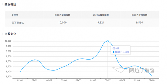 在2月1号至今,游戏指数的振幅在9400-10000之间,整体上保持较高水平,可见游戏近期在微信小游戏圈内的热度相当不错,截至目前游戏在阿拉丁指数上录得的最高指数为10000点,但游戏在后续几天的指数出现了持续的下滑。