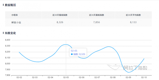 《解救小宝》首次录得指数时间在2月2号,当时游戏同样以超过8100的高数值直接空降阿拉丁榜单头部。随后游戏的指数表现同样在8300-8000出现了小幅的波动,整体上的热度相当不错,但是从趋势来看增长的“后劲”似乎略显不足,在8号-9号期间游戏的指数出现了明显的下滑,但是在10号再度出现了反弹。