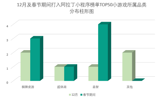 对于19年在商业化上成绩斐然的小游戏来说,这个春节假期的收获似乎也相当丰厚。参考阿拉丁研究院的数据:与12月相比,春节假期间打入阿拉丁指数小程序榜单头部的小游戏数量出现了明显的增长。除了一贯表现不错的超休闲以及益智类小游戏之外,棋牌类小游戏在这个假期的表现也相当出色。