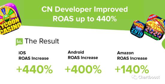 第一个案例是欧美头部Social casino开发者,该产品运营时间比较久,面临买量瓶颈,手动调整工作繁多耗时,对接Chartboost DSP并经过一个月优化之后,双端ROAS平均提升了两倍以上。