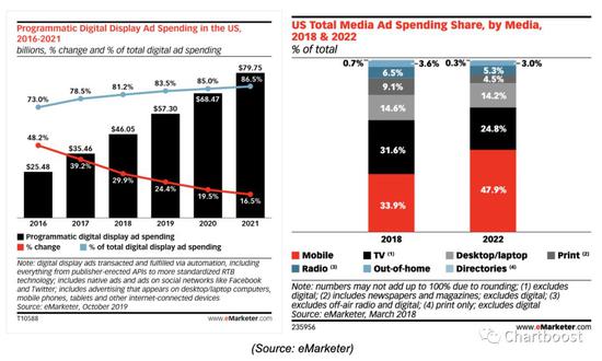Chartboost始终认为,程序化是移动营销的未来。根据eMarketer和App Annie数据,在美国,程序化广告购买的规模逐年上升,2020年85%的数字广告将通过程序化的方式进行,并且从2020年到2022年,移动端程序化广告支出的份额将逐年上升。