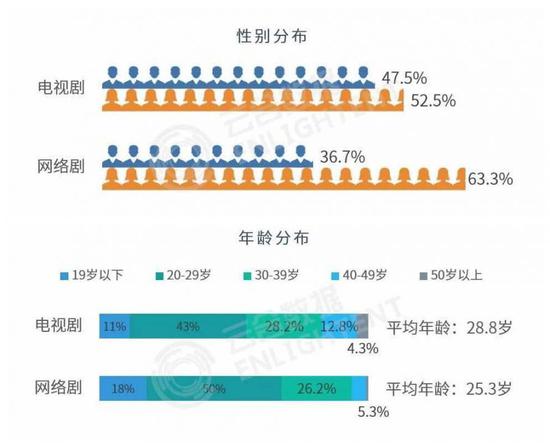 云合数据年初发布的影视剧行业报告《2019全年连续剧网播表现及用户分析》中指出,2019年上新连续剧女性占比为52.5%,平均年龄为28.8岁;其中,网络剧用户呈现更加女性化、年轻化特点,网络剧女性占比63.3%,平均年龄为25.3岁。