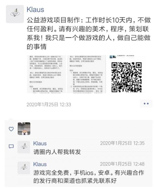 春节这天中午,Klaus将自己写的一份简易游戏策划案发在朋友圈里,并注明了这是一个不盈利的公益项目。