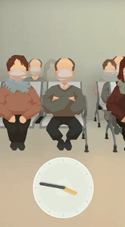 而在第三章里,玩家们则是会扮演医生,一个比较有情感共鸣的交互设计是,玩家能与一块时钟交互,通过拨动它让候诊的患者逐渐减少。