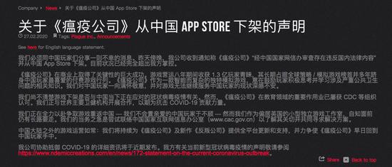 《瘟疫公司》开发商 Ndemic Creations 已于 2月27日晚间发布了游戏下架的声明,声明内容如下: