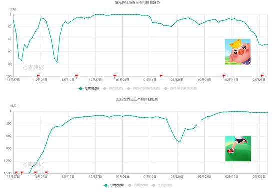 在2月27日的App Store免费总榜上,排名第21的是一款叫做《旅行世界》的产品,上线时间是去年10月24日;与之相对霸榜游戏免费榜近2个月的《阳光养猪场》,总榜排名49,上线时间为去年10月29日。