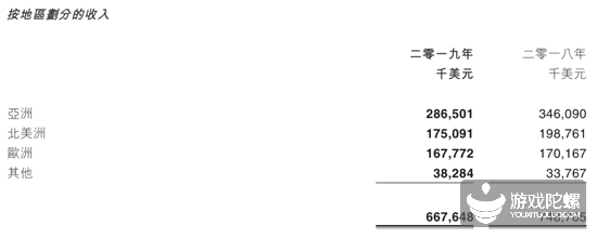按地区划分收入来看,来自亚洲地区收入仍然位列第一,但同比2018年下滑明显,总收入为2.865亿美元,下滑约17%。从数据来看,IGG去年收入下降受亚洲地区影响最甚。北美地区及欧洲地区的收入相较于2018年也均有所下滑。