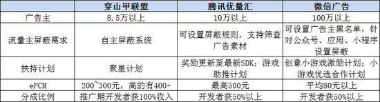 总体来看,优量汇、微信广告都围绕腾讯内外部资源做文章,通过人工筛选出有潜质的游戏,帮助游戏调优,提升游戏买量及变现水平。不过这样的让利是有门槛的,只向高品质游戏开放。