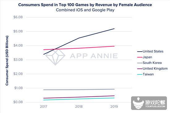 以全球iOS + Google play综合数据、全球最热门的100款用户支出最高的游戏为基础,从2017年到2019年,美国、日本、韩国、英国和台湾地区的女性玩家游戏支出都得到了不同程度的提升。美国的女性游戏玩家支出增速最快,三年时间增长近20亿美元。