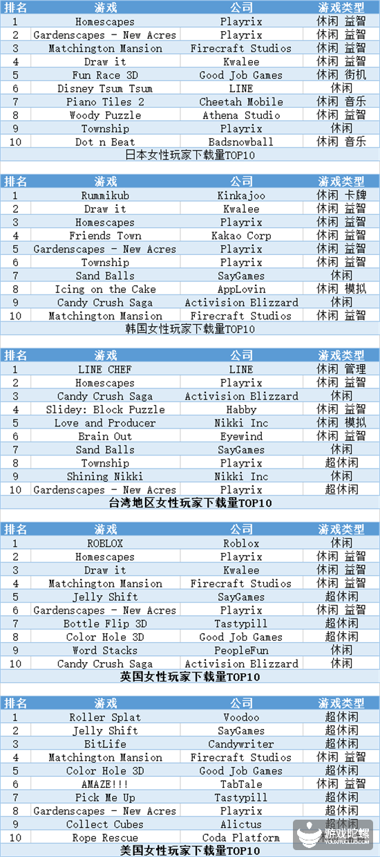 以下各国家/地区以女性玩家下载量TOP10的游戏,均以女性玩家占游戏60%以上的月度活跃用户数量为基础,综合iOS和Google Play数据得出。