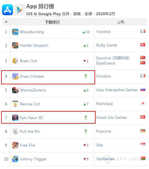 超休闲游戏在海外的火爆的程度远超于国内,全球范围内的超休闲小游戏的下载量主要由美国、印度、俄罗斯等海外市场贡献,在种类繁多的超休闲游戏中有不少游戏的玩法都是基于跑酷游戏的简化或变种,比如根据APPannie二月全球下载排行显示,排在第4的《画腿攀登》与排在第7的《Epic Race 3D》均为跑酷游戏的变种。