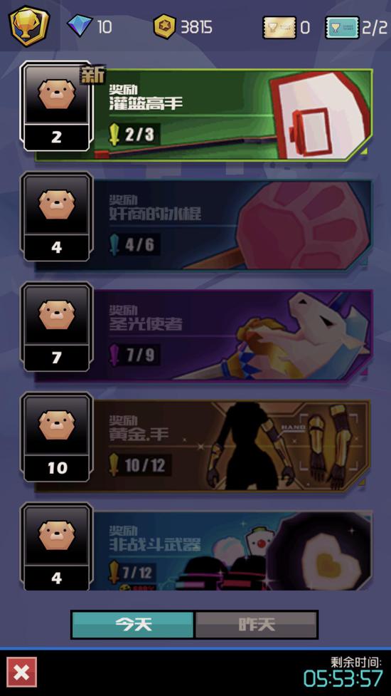 目前游戏中大部分道具都可以通过看广告获取,在武器上主要是通过游戏的活动模式获取。游戏中一共分为三种模式供玩家选择,“无尽模式”、“活动模式”、“DARK战”。其中活动模式玩核心玩法类似于其他游戏的“挑战模式”,玩家根据互动的要求达成不同程度的挑战便可获得相应的奖励,这也是目前游戏除广告外获取武器的主要手段。
