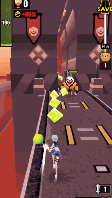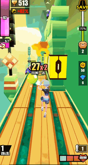 可能有些玩家会好奇,在跑酷游戏的玩法上融入了战斗会不会让游戏的操作便复杂?实则不然,游戏虽在玩法上做了加法,但在操作上并没有。游戏的玩法与大多竖屏跑酷类游戏相同,玩家向上滑可以操作角色跳跃,左右滑动则是操控角色左右移动,向下滑动可以使角色短暂的提升移速。游戏的战斗方式与此也是同事进行的,比如玩家在应对正前方的敌人时,在靠近敌人后向上滑动便可发起攻击,而在左侧与右侧的敌人也是如此,在靠近时向左右滑动即可发起攻击。