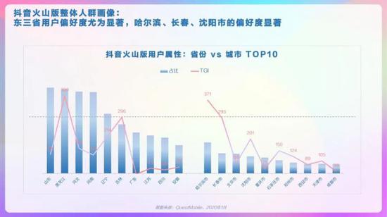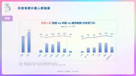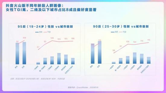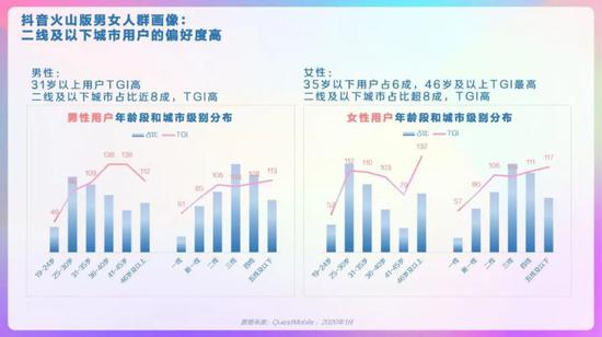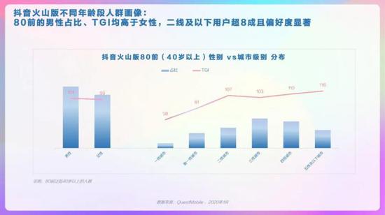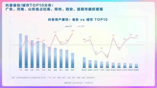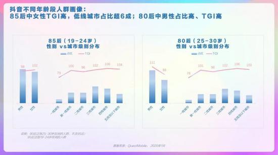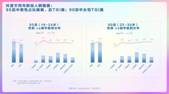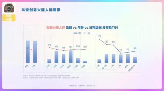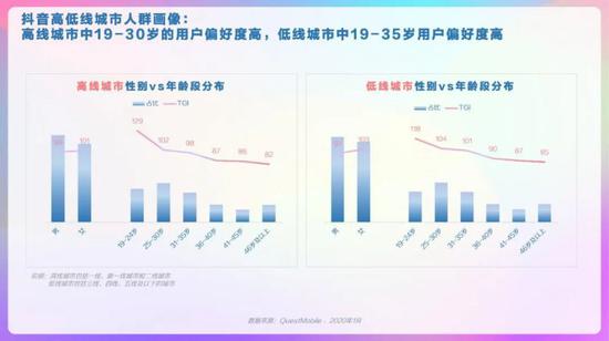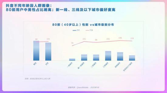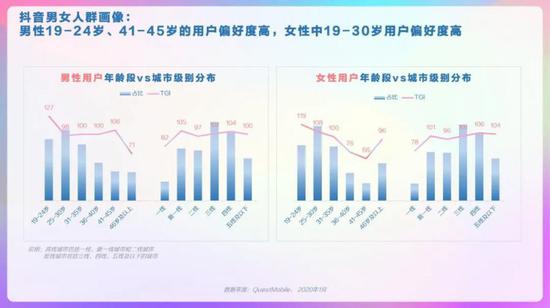 抖音整体人群画像,男女较均衡,19-30岁TGI高,新一线、三线及以下城市用户TGI高。抖音省份/城市TOP10分布,广东、河南、山东省占比高,郑州、西安、昆明市偏好度高。抖音男女人群画像,男性19-24岁、41-45岁的用户偏好度高,女性中19-30岁用户偏好度高。抖音高低线城市人群画像,高线城市中19-30岁的用户偏好度高,低线城市中19-35岁用户偏好度高。抖音不同年龄段人群画像,95后中男性占比略高、且TGI高;90后中女性TGI高。抖音不同年龄段人群画像,85后中女性TGI高,低线城市占比超6成;80后中男性占比高、TGI高。