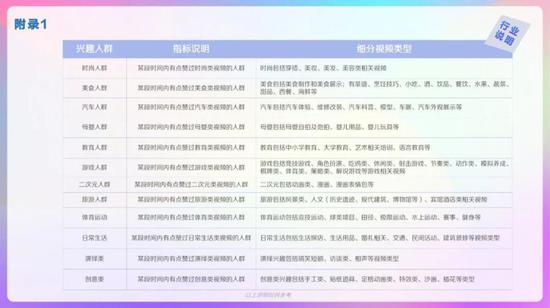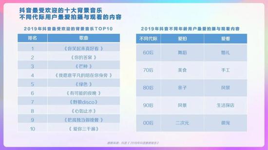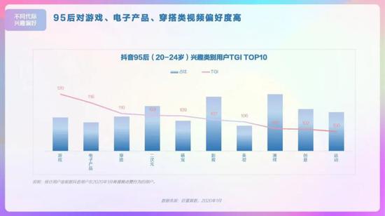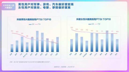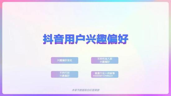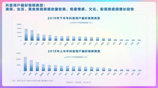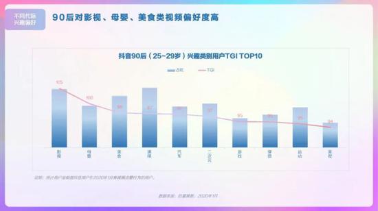抖音用户偏好视频类型,演绎、生活、美食类视频播放量较高,观看情感、文化、影视类视频增长较快。男性用户对军事、游戏、汽车偏好度较高,女性用户对美妆、母婴、穿搭偏好度高。00后对游戏、电子产品、时尚穿搭类视频偏好度高。95后对游戏、电子产品、穿搭类视频偏好度高。90后对影视、母婴、美食类视频偏好度高。80后对汽车、母婴、美食类视频偏好度高。