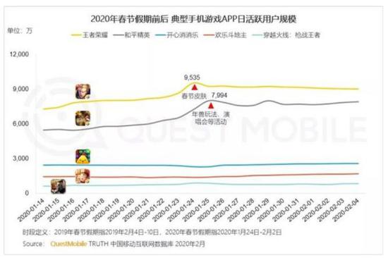根据QuestMobile的统计,《王者荣耀》春节期间的日活峰值达到了9535万。另一款腾讯系吃鸡手游《和平精英》也有7994万的日活峰值。此外,两款游戏还分别获得了2629万以及2747万的日均用户增长。