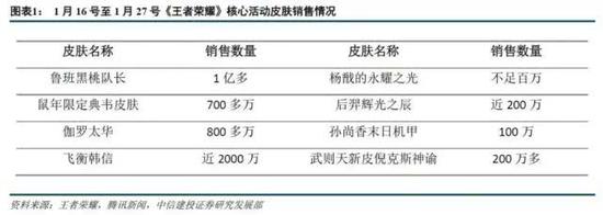 根据中信建投证券研究发展部的估算,核心皮肤之一的鲁班七号6元福利皮肤,在1月16日到1月27日之间销量达到了1亿,即6亿元的销售额。销量紧随其后的是韩信的鼠年限定皮肤,2000万的销量带来了28.6亿元的销售额。而整个鼠年限定皮肤的销量,达到了1500万。
