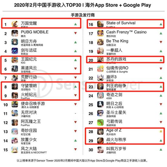 据Sensor Tower最近发布的2020年2月中国手游出海收入榜显示,莉莉丝游戏的SLG手游《万国觉醒》以7100万美元(约合人民币5亿元)的月流水再次夺得了出海收入冠军。