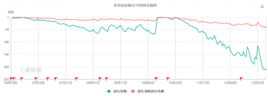 《多多自走棋》作为自走棋祖宗产品,在上线之初一度冲上免费榜前三,夺得榜首。但好景不长,不到半个月就跌出前十,在数据转移腾讯服后虽回春一波,但在20天后还是一路狂跌。