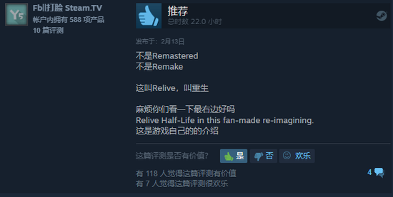 对于玩过《半条命》的老玩家,这款游戏提供了重温经典的另一种形式,并且附赠了一些新的体验。就像Steam上另一条高赞评论所说的那样,这不是remaster或者remake,这是“relive”。而对于没有接触过本系列的玩家,粉丝重制版的《黑山》则把《半条命》变成了一个更贴近当下的游戏。