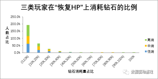 三类玩家各成员在‘恢复HP’类型的消耗量与钻石消耗总量的比例集中在(0,10%],高端类型成员更轻视“恢复HP”类型,不到1%的成员会将钻石的30%消耗在此类型;