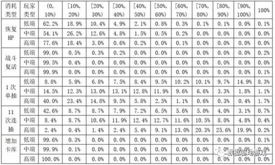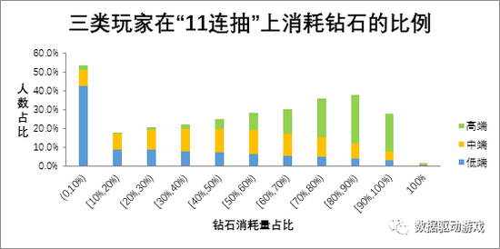 三类玩家各成员在抽卡上的消耗比例的分布趋于平缓,不突兀,高中低三类的消耗比例的分布呈现差异化: