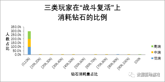 高、中、低端玩家中均超过99%的成员为“战斗复活” 消耗的钻石小于其家当的10% 。
