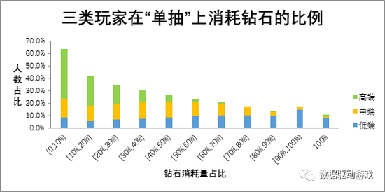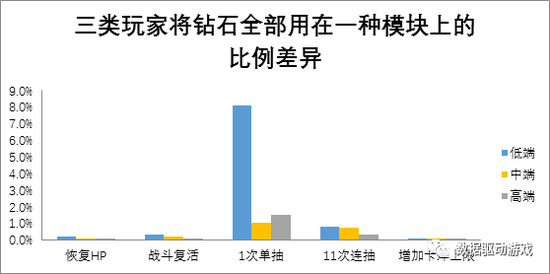 由下图可见,高中低三类玩家中均有一定比例成员孤注一掷将所有钻石用在单一的消耗方式。其中,“单次抽卡”这种消耗方式占比最高,有8%的低端用户将全部钻石放在单抽上。