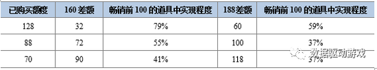 目前主流道具的金额在128元,88元,70元,如果用户分别购买了这三个主流必要道具,还需花费的差额实现容易程度,第二个档次中160元相比188元用户更容易选择其他金额的道具来实现满额,提升幅度分别为20%、18%、4%,如表2所示。