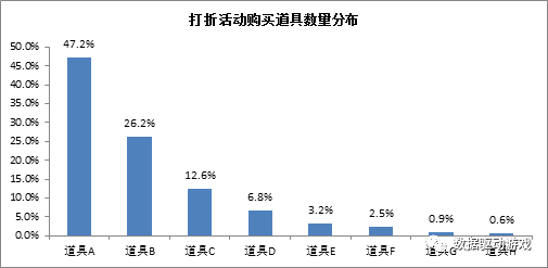 道具打折活动,共有12837名用户参与了折扣购买行为,图18是打折活动期间的道具购买数量分布,表1是打折道具的购买人数情况,此次活动累计创造收入235万元,活动期间每个用户平均付费金额(ARPPU)为183元,比未进行满减活动的单个用户ARPPU提高47%。
