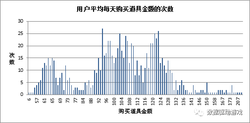 (5)从历史数据看,用户平均每天购买次数的道具金额集中在[90,130]区间,如图17所示。