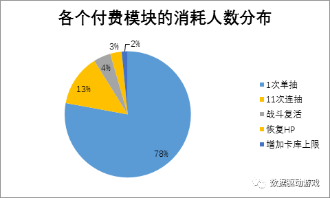 该游戏的收入构成主要有五个模块,分别为:1次单抽、11连抽、战斗复活、恢复HP、增加卡库上限。我们先通过各模块的付费人数和收入分布,从宏观上了解这款游戏的收入构成。