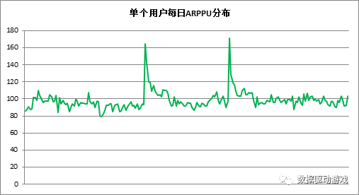 (4)单个用户每日平均ARPPU为100元,除了个别的活动时间之外,其余时间均比较稳定,如图16所示。